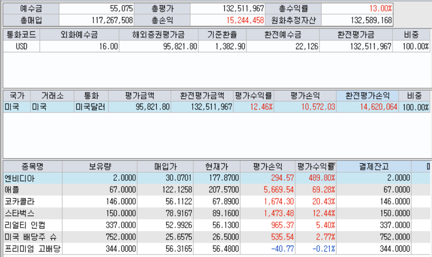 미국증시의 상승에도 불구하고, 저의 포트는 배당주 위주로 구성되어 있어 큰 상승을 맛보지는 못하였습니다. 다만 원/달러 환율의 상승으로 인해 자산가치가 2백만원 정도 상승하였습니다.